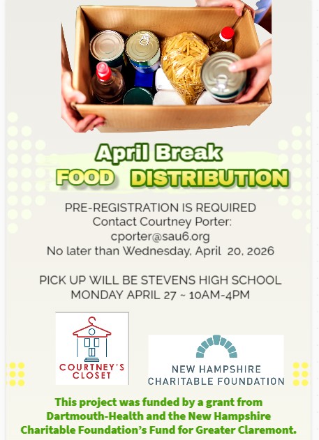 SAU 6 will be offering food supports to families during the April break. This project is funded by a grant from Dartmouth-Health and the New Hampshire Charitable Foundation’s Fund for Greater Clare...